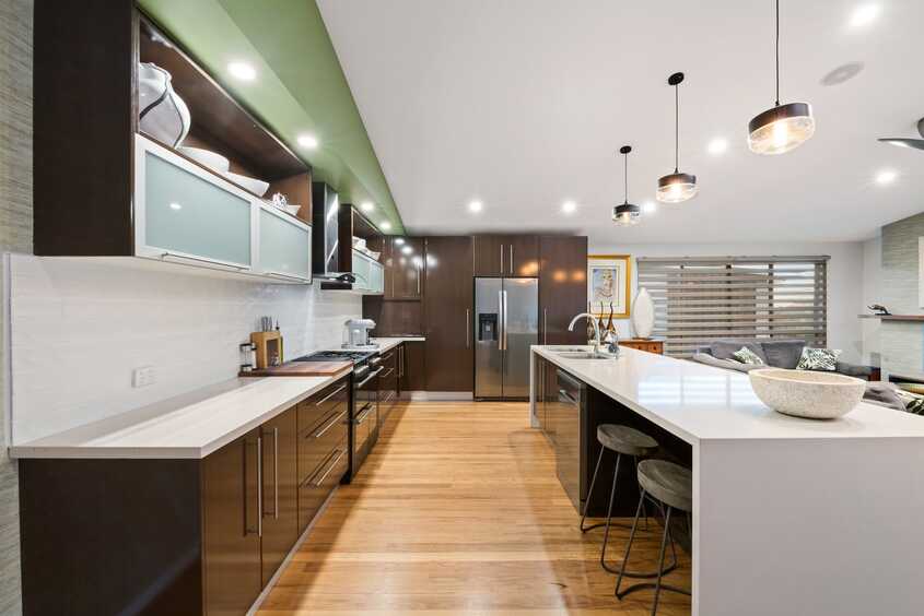 The kitchen is a chefs delight. A modern L-shaped style with large pantry, top shelf appliances, gas cooktop, island bench & breakfast bar.