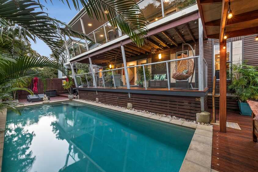 A cabana at the East end contains a fireplace, TV and lounges on timber decking.