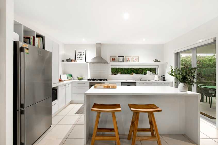 - Striking white galley style kitchen leads to the large outdoor patio.